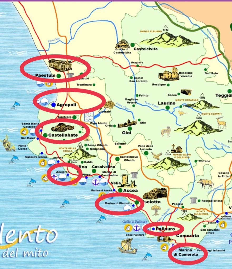 L’idea è quella di arrivare in macchina da Salerno fino a Palinuro, e da lì, riportarmi verso Nord fino ad arrivare a Castellabate. Queste infatti sono le uniche mete sicure, quelle per cui qualche settimana prima ho prenotato dei bellissimi posti dove ristorarmi: Al Fico Secco a Palinuro e Residenza Tamara a Castellabate. Per il resto dei giorni, unico obiettivo: Scoperta. I luoghi circondati in rosso sono quelli che mi piacerebbe vivere.